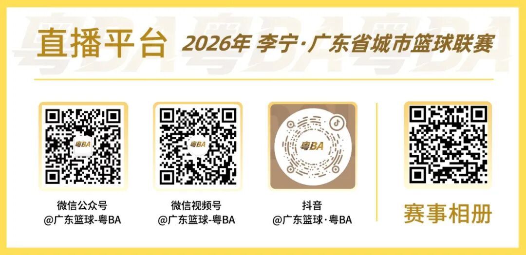 2026年李宁·广东省城市篮球联赛第二轮今日开打,为了让更多的小伙伴能够感受粤BA的浓烈氛围,我们已经准备了高清直播和场外观赛活动,快喊你的小伙伴一起给主队加油,齐齐粤BA,周末约定你!
